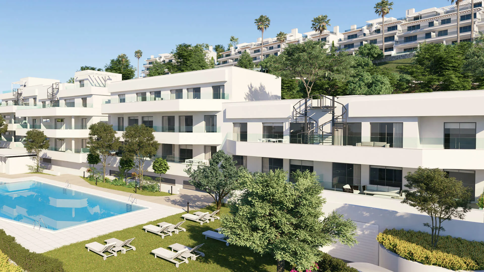 Die Apartments verteilen sich auf drei Etagen und bieten wahlweise große Terrassen oder private Gärten. Alle Wohnungen sind klimatisiert und verfügen über einen privaten Stellplatz. Das zeitgenössische Design verbindet Funktionalität mit mediterraner Eleganz.