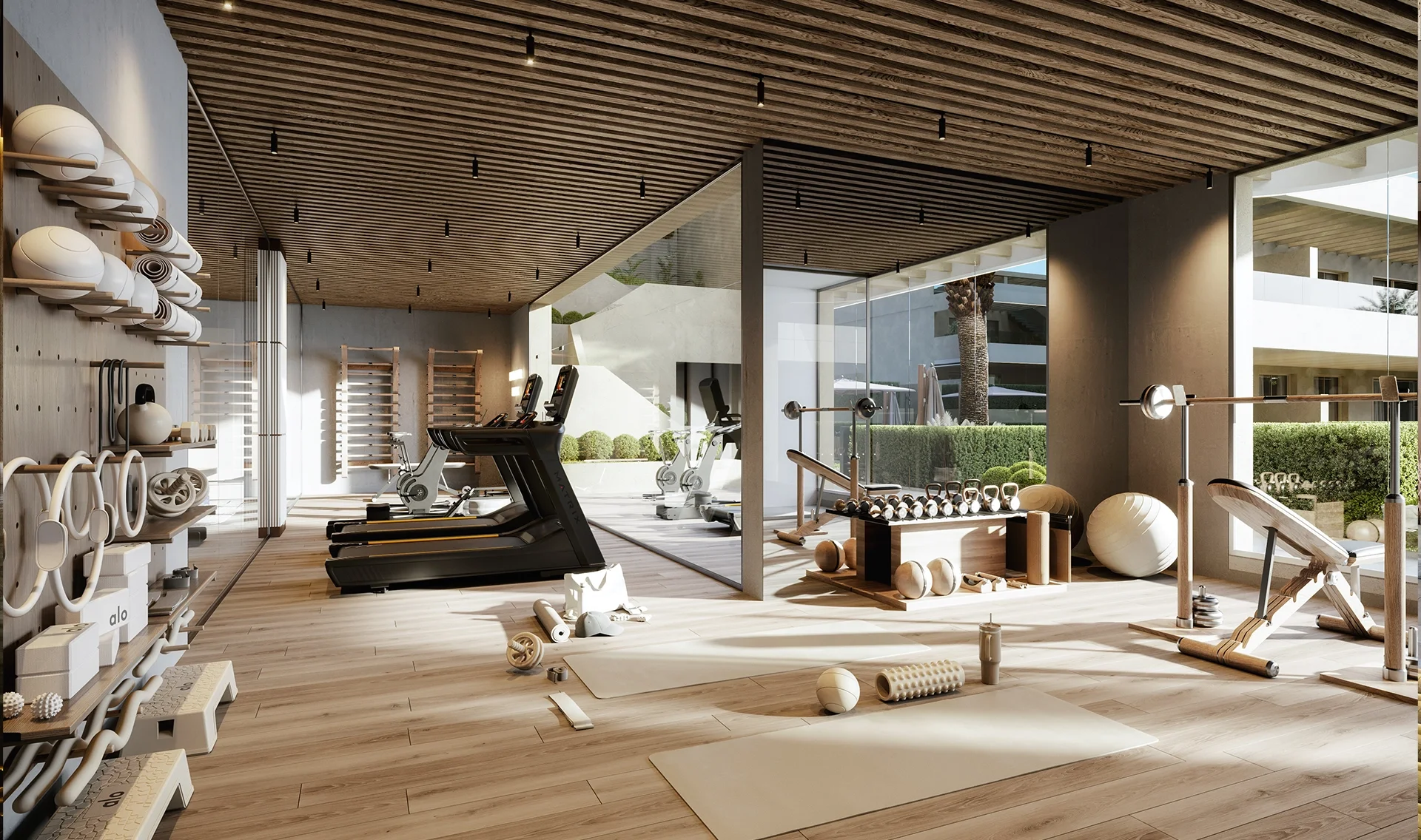 Die Gemeinschaftsbereiche von Omnia in Estepona sind ebenso durchdacht wie die Residenzen selbst: Landschaftlich gestaltete Gärten, beruhigende Wasserspiele und ein exklusiver Social Club mit Wellness- und Coworking-Bereichen laden zum Entspannen und Arbeiten ein. Ein beheizter Innenpool sowie Nass- und Trockensaunen runden das Angebot ab.