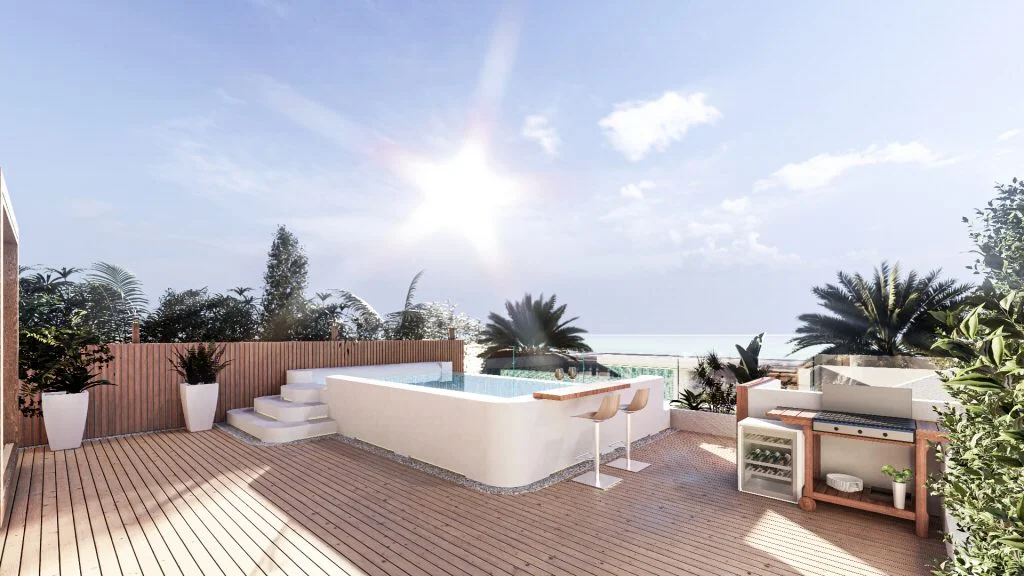 Die Architektur fügt sich harmonisch in die mediterrane Landschaft ein und betont natürliches Licht, offene Räume und Nachhaltigkeit. Bewohner genießen Dach- und Gartenpools, Fitnesscenter mit Sauna, Co-Working-Spaces, 24-Stunden-Sicherheit und Concierge.