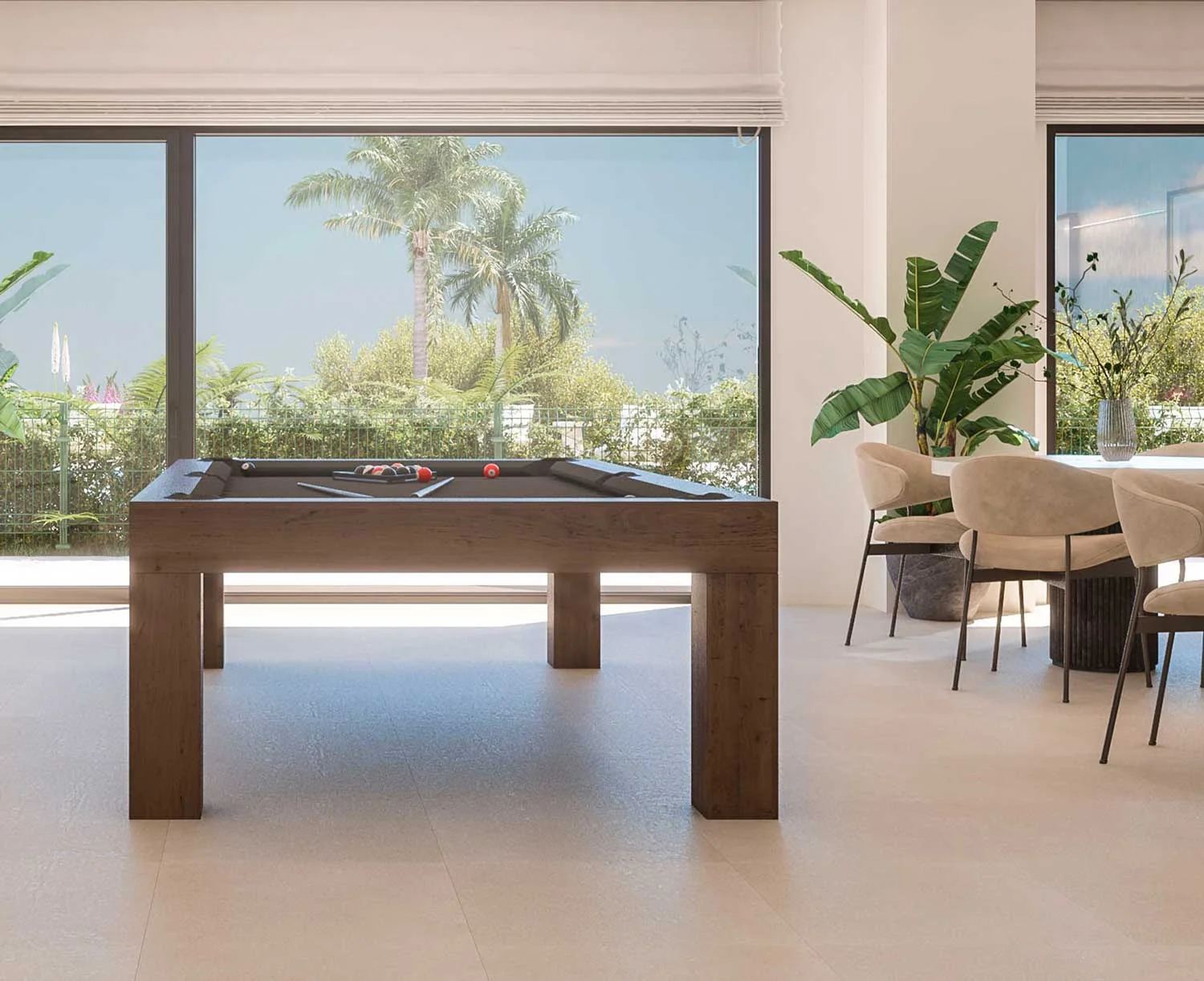 Die Annehmlichkeiten gehen weit über das Übliche hinaus: Yoga-Bereiche, ein luxuriöser Spa mit Hammam, Jacuzzi und Sauna, dazu Co-Working-Spaces, Multimedia- und Spielzonen. Üppige Grünflächen und einladende Pools vervollständigen das Bild einer Anlage, die Entspannung und Aktivität perfekt verbindet.
